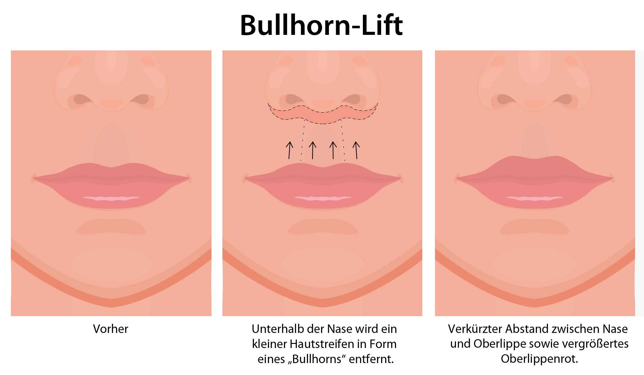 Der Bullhorn-Lift ist ein kleiner chirurgischer Eingriff, der zur dauerhaften Verjüngung der Mundpartie eingesetzt wird. Dabei wird der Abstand zwischen Mund und Nase durch Entfernung einer kleinen Hautpartie verkürzt, wodurch das Gesicht verjüngt und die Oberlippe angehoben wird. Durchschnittlich sind Patientinnen (es sind überwiegend Frauen, die sich dieser Operation unterziehen) zwischen 50 und 60 Jahren. Doch auch bei wesentlich älteren beziehungsweise jüngeren Frauen wird dieser Eingriff durchgeführt, da der Nutzen der Operation stark von der individuellen Veranlagung (Hautelastizität, Fältchenbildung) abhängt.